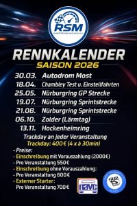 Die Termine für unsere Rundstreckenrennen (RSM) im Jahr 2026 sind unter dem Menüpunkt „Rundstrecke“ veröffentlicht.